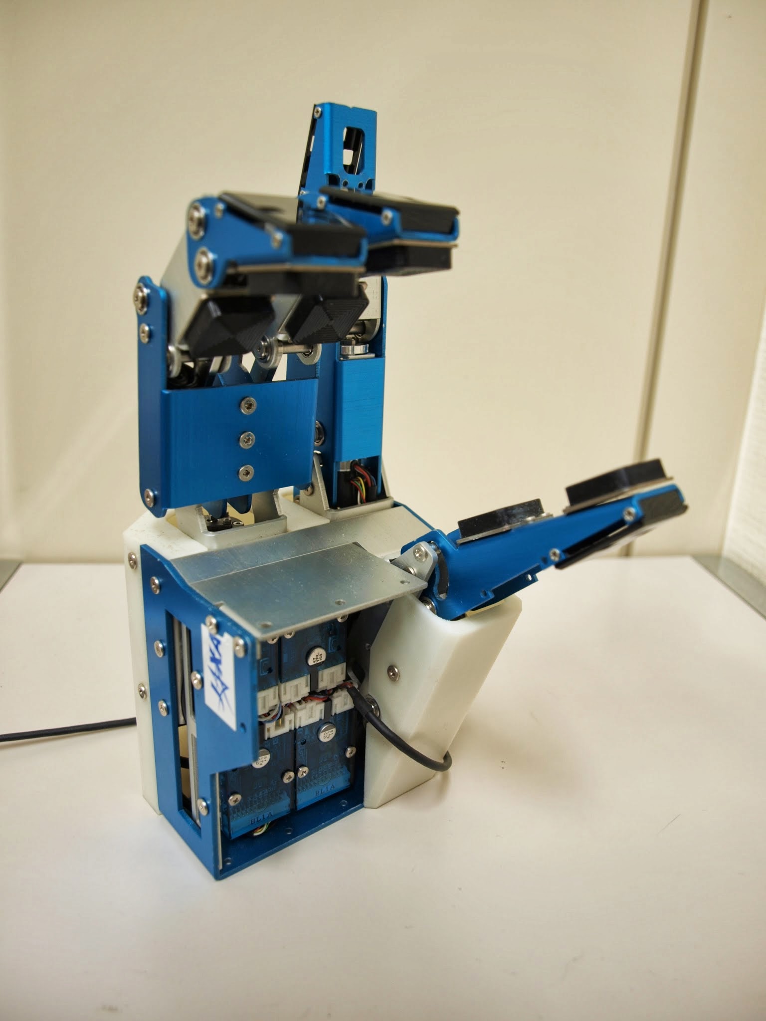指にボールねじを組み込むことでモータの回転運動を直線運動に変換し、小型でありながら30kgという人間並みの握力を達成した。
